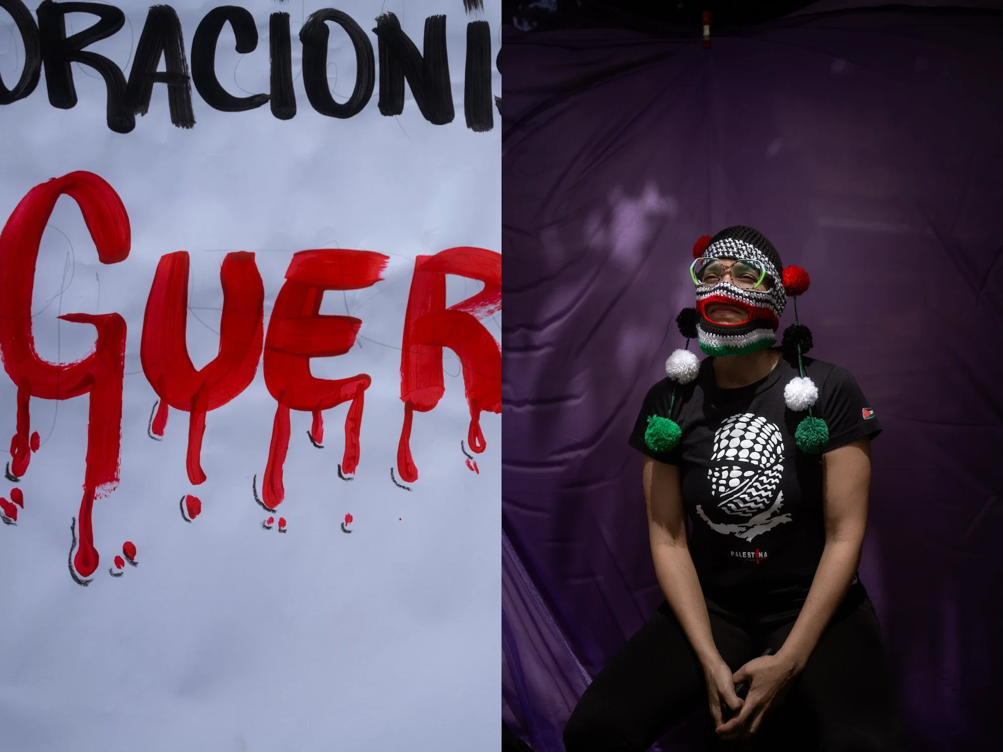 Izquierda: Letrero en contra de la guerra en la manifestación por el Día Internacional de la Mujer. Derecha: manifestante en la protesta por el Día Internacional de la Mujer en la plaza Brión en Caracas, Venezuela, el 8 de marzo, 2026. Foto © Andrea Hernández Briceño.