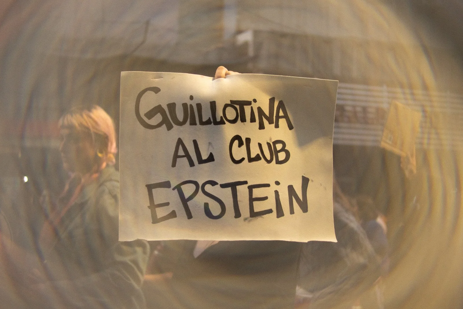 Manifestante con un cartel que dice “Guillotina al club Epstein” el 8 de marzo, 2026, en Montevideo, Uruguay. Foto © Bettina Franco.