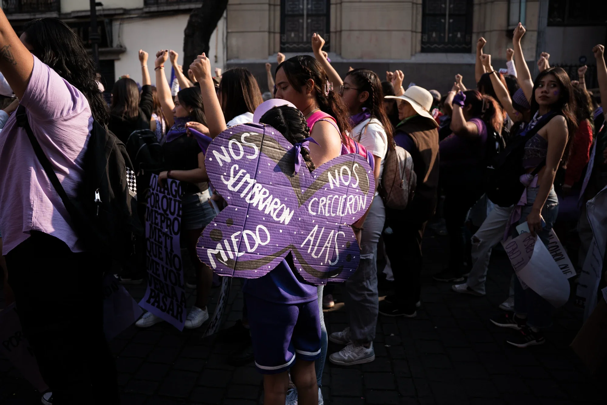 Infancia con unas alas que dicen “Nos sembraron miedo, nos crecieron alas” y manifestantes levantando el puño durante la marcha del 8M el 8 de marzo, 2026, en la Ciudad de México. Foto © Aurea del Rosario.